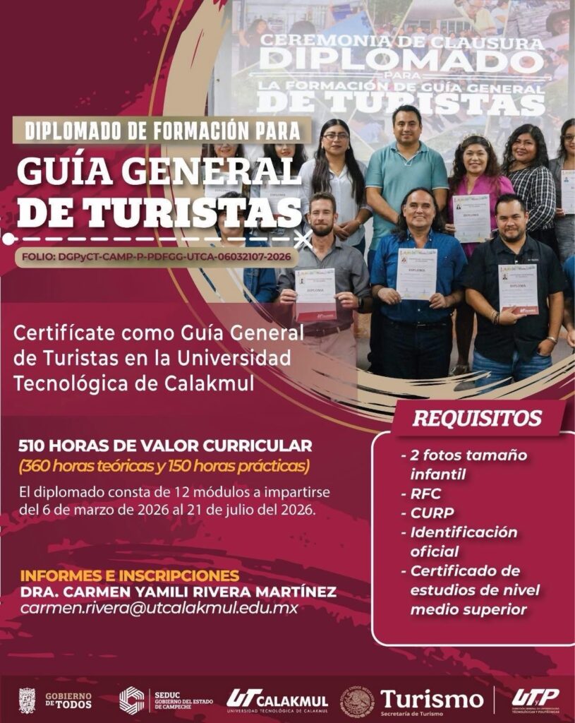 Tips Viajeros🌍📣DIPLOMADO DE GUÍAS DE TURÍSTAS GENERALES📣🌍 19 febrero, 2026092 Compartir0 Diplomado de formación de Guías de Turistas Generales conforme a la NOM-08-TUR-2002. 📣¡INICIAMOS EN MARZO!📣 Contacto al https://w.app/vc4drt para WhastApp https://forms.gle/kAtmqYGRTeeYTxHZ6 para el registro de guías.